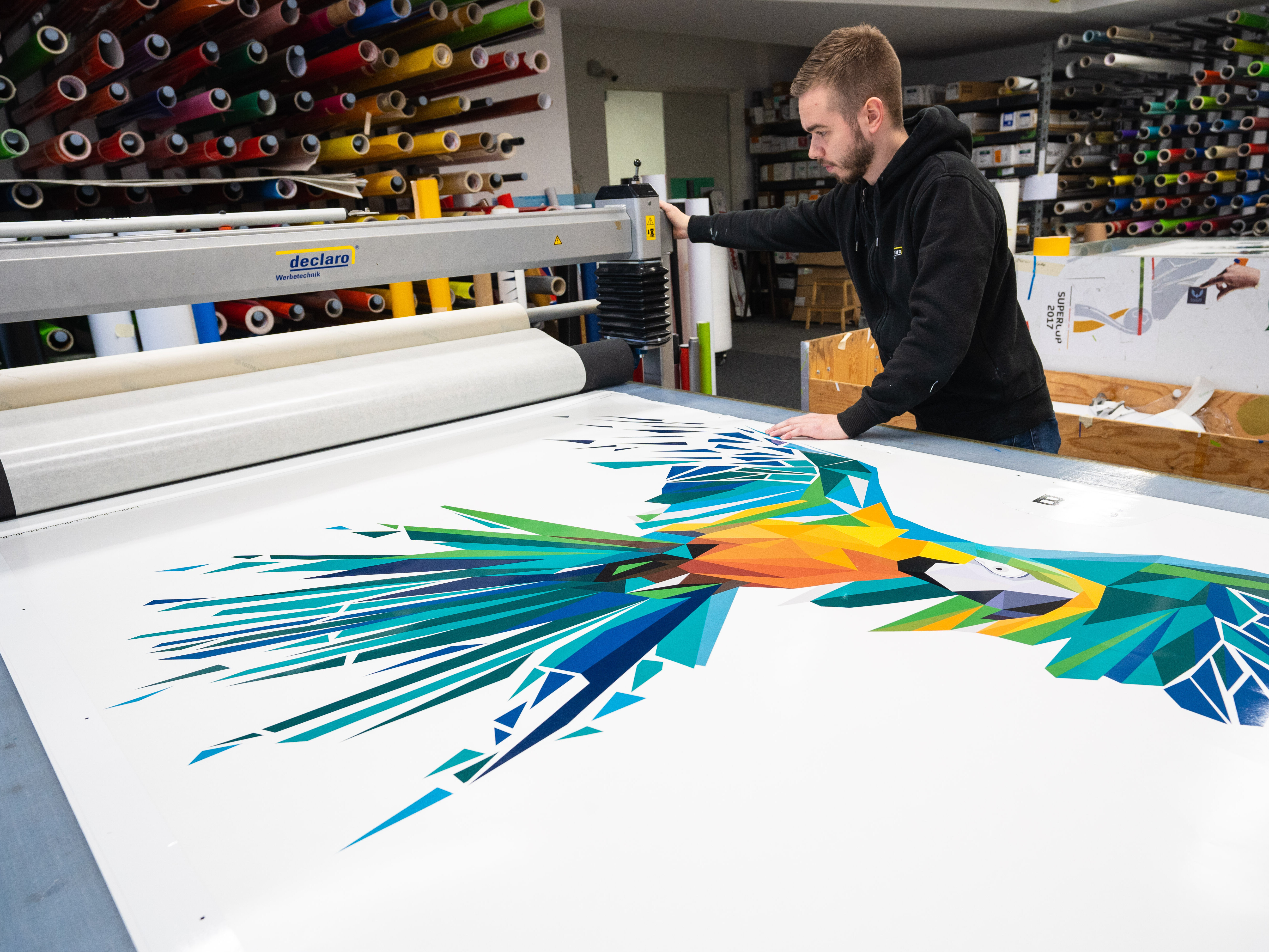 - Bedienung von modernen Maschinen, wie z. B. Großformatdigitaldruckern, Schneidtisch, Plotter, Fräse, Laminator